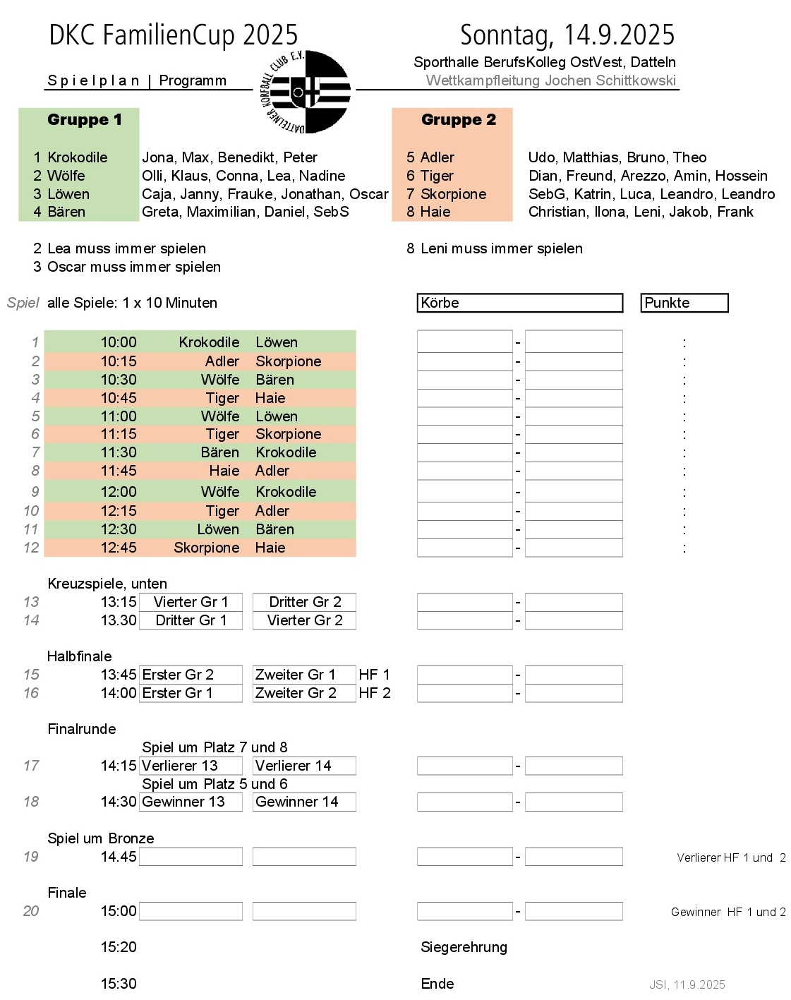 Bei dieser Meldeanzahl mussten wir 2 Gruppen bilden. Insgesamt sind 20 Spiele geplant. Das erste Spiel der Gruppenphase startet um 10:00 Uhr. Die Finalphase beginnt um 14.15 Uhr. Das Finale ist für 15:00 Uhr geplant, die Siegerehrung für 15.20 Uhr.
